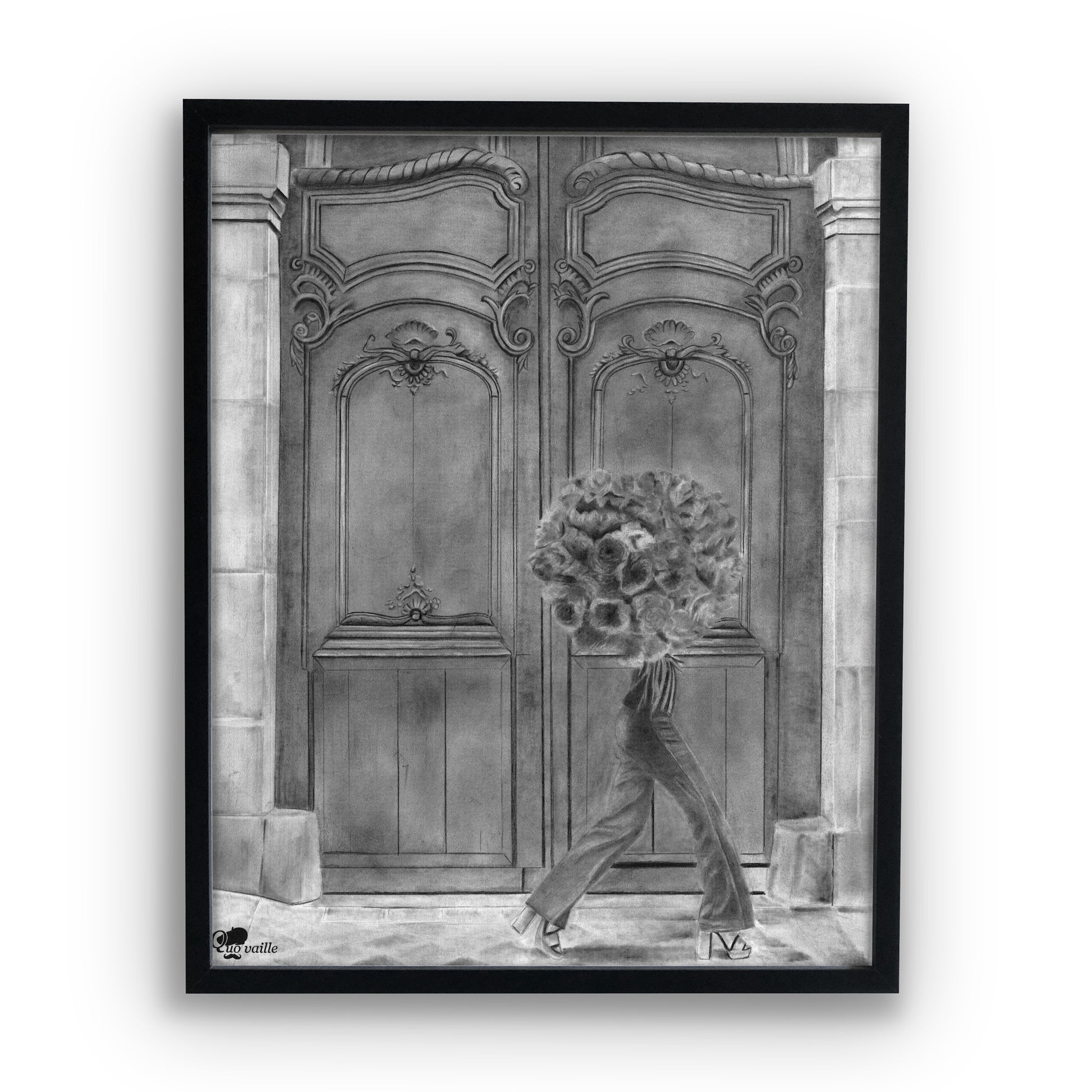 Ce dessin d’une femme avançant devant une grande porte en bois ornée, le visage dissimulé par un bouquet de fleurs, mêle mystère et élégance. Le contraste entre la porte sculptée et les couleurs florales crée une scène poétique et envoûtante, parfaite pour apporter une touche artistique et raffinée à votre intérieur.