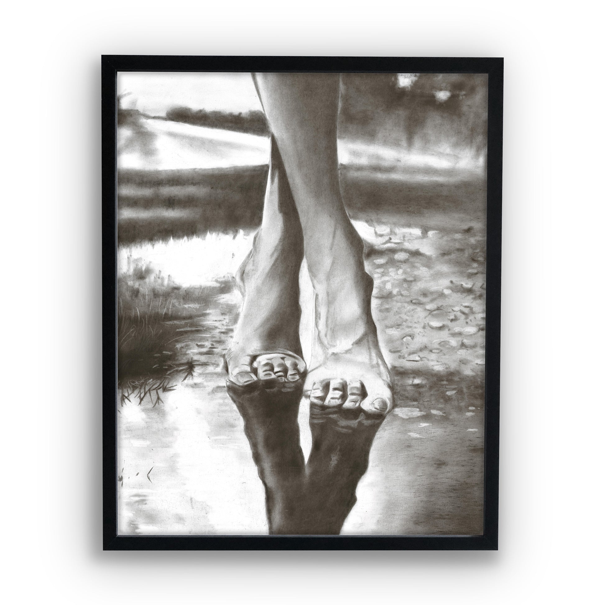 Ce dessin mettant en scène des jambes se reflétant dans une flaque d’eau joue subtilement avec la lumière et la perspective. Le contraste entre la silhouette et son reflet crée une atmosphère élégante et poétique, idéale pour apporter une touche artistique et moderne à votre intérieur.