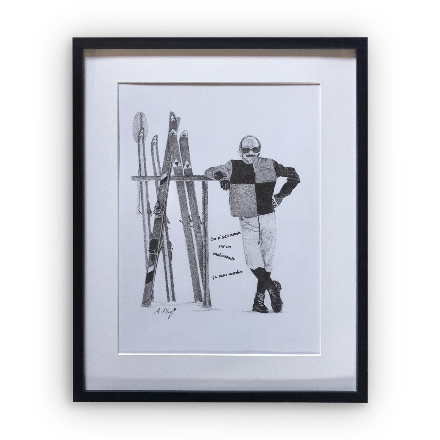 Ce dessin capture l’humour de Michel Blanc dans le film culte Les Bronzés font du ski, le montrant de face, accoudé à un porte-skis. L'œuvre évoque instantanément les scènes inoubliables et l’esprit décalé du film, parfait pour tous les nostalgiques de cette belle aventure cinématographique.