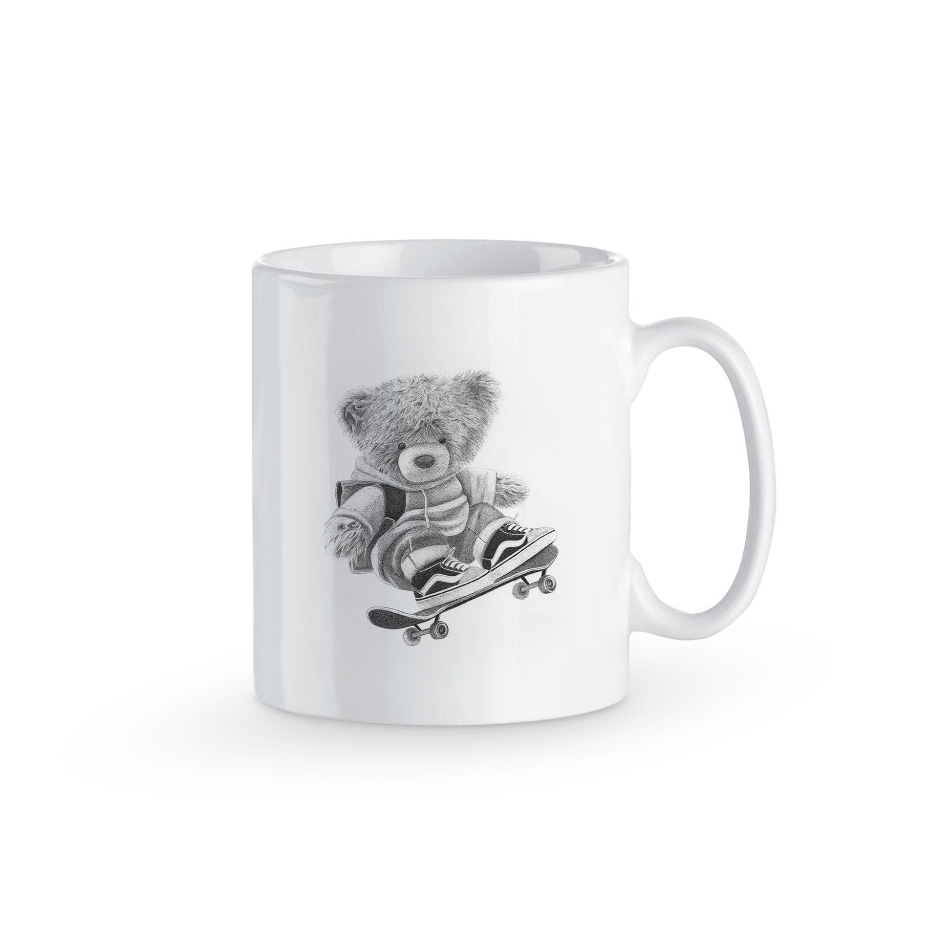 Ce dessin montre un ours en peluche en pleine action, faisant du skate avec aisance, habillé comme un véritable skateur. L'illustration capture la dynamique du mouvement pour créer une ambiance ludique pleine de tendresse.